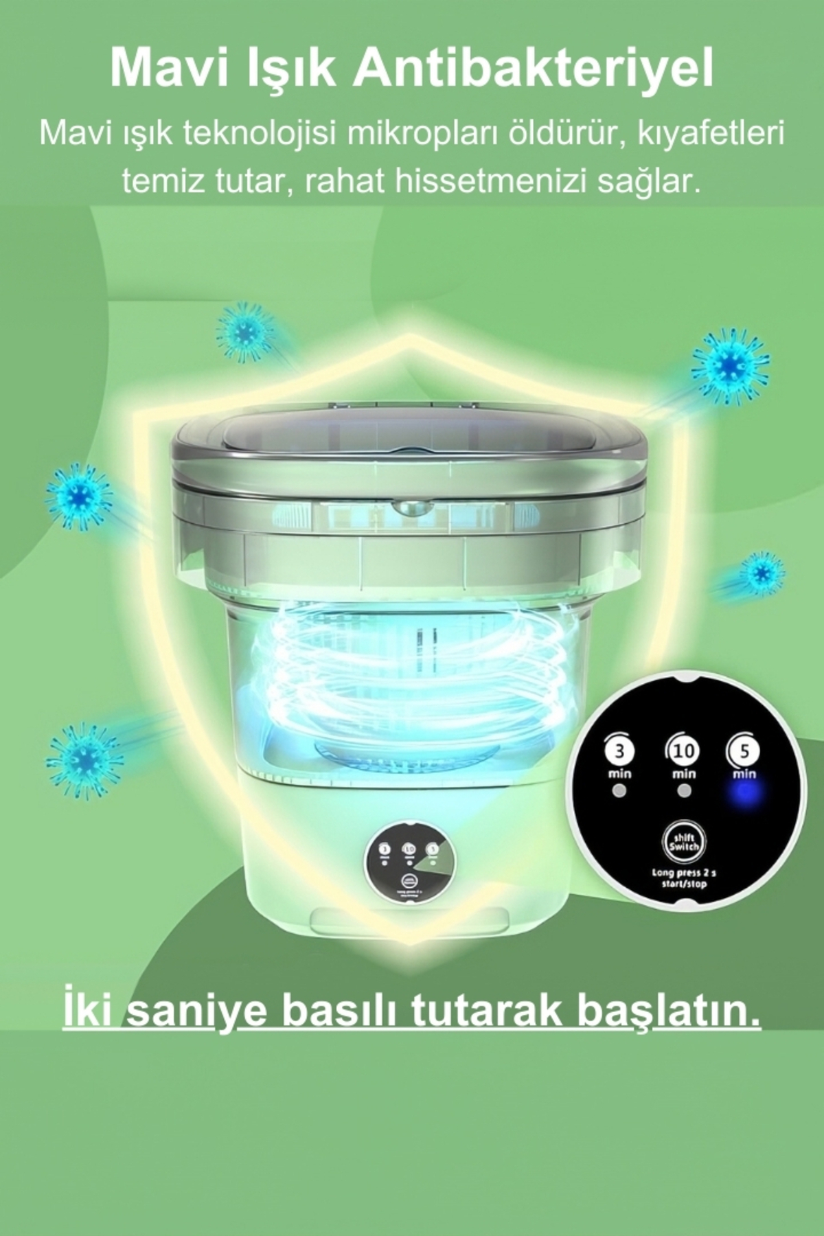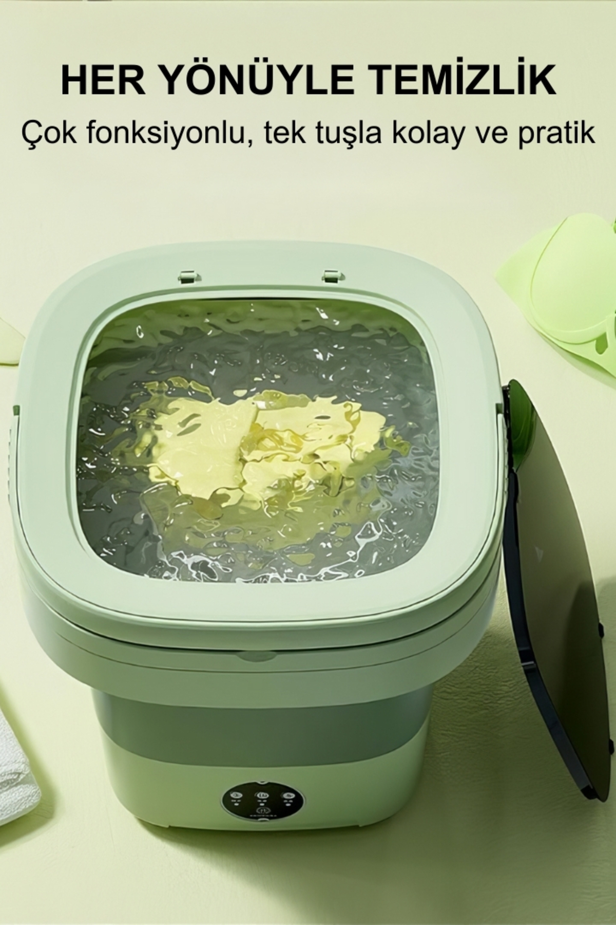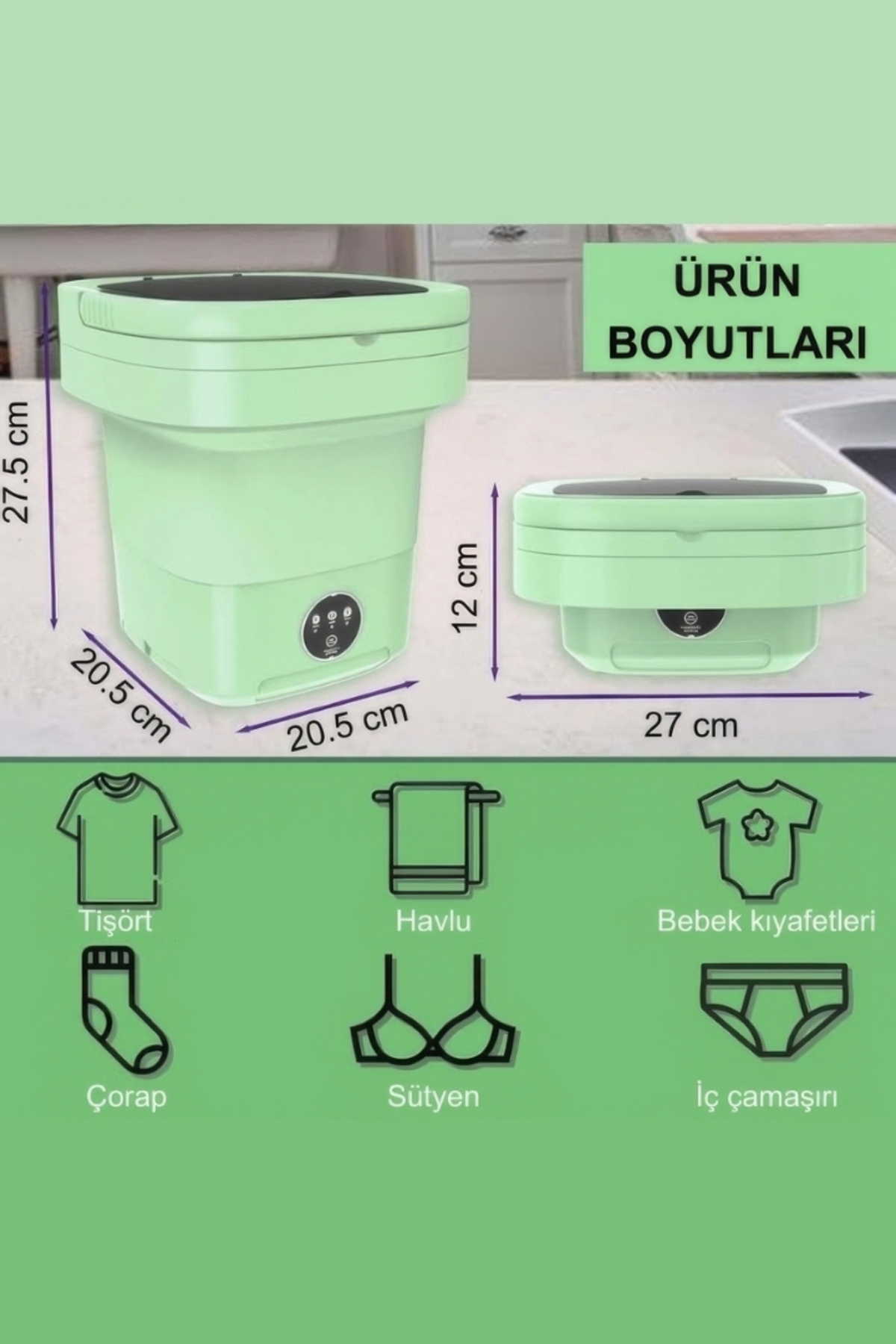 - – Kompakt tasarımı ile 60 cm yükseklik ve 40 cm derinlik ölçülerinde olan bu çamaşır makinesi, kamp, yurt ve karavan gibi alanlarda kolayca taşınabilir ve saklanabilir