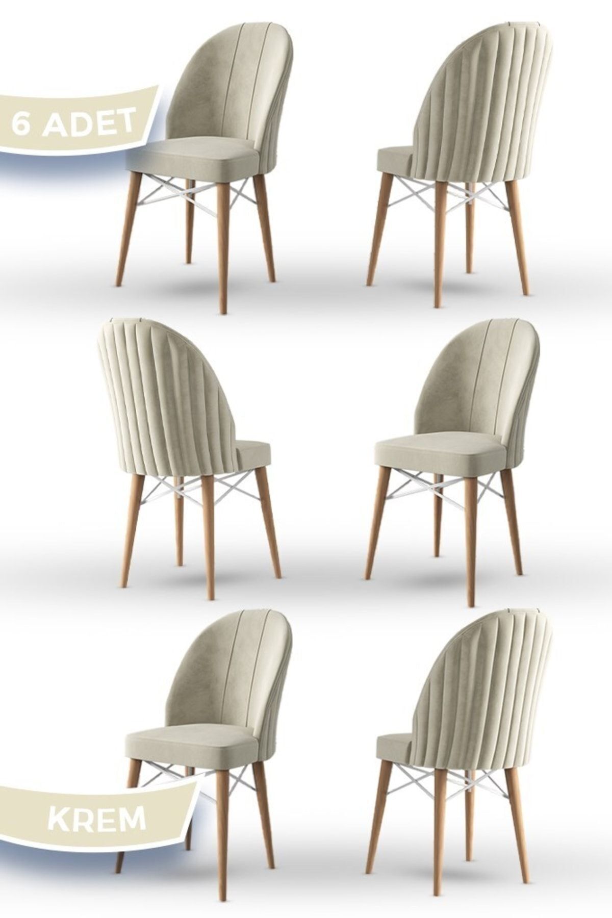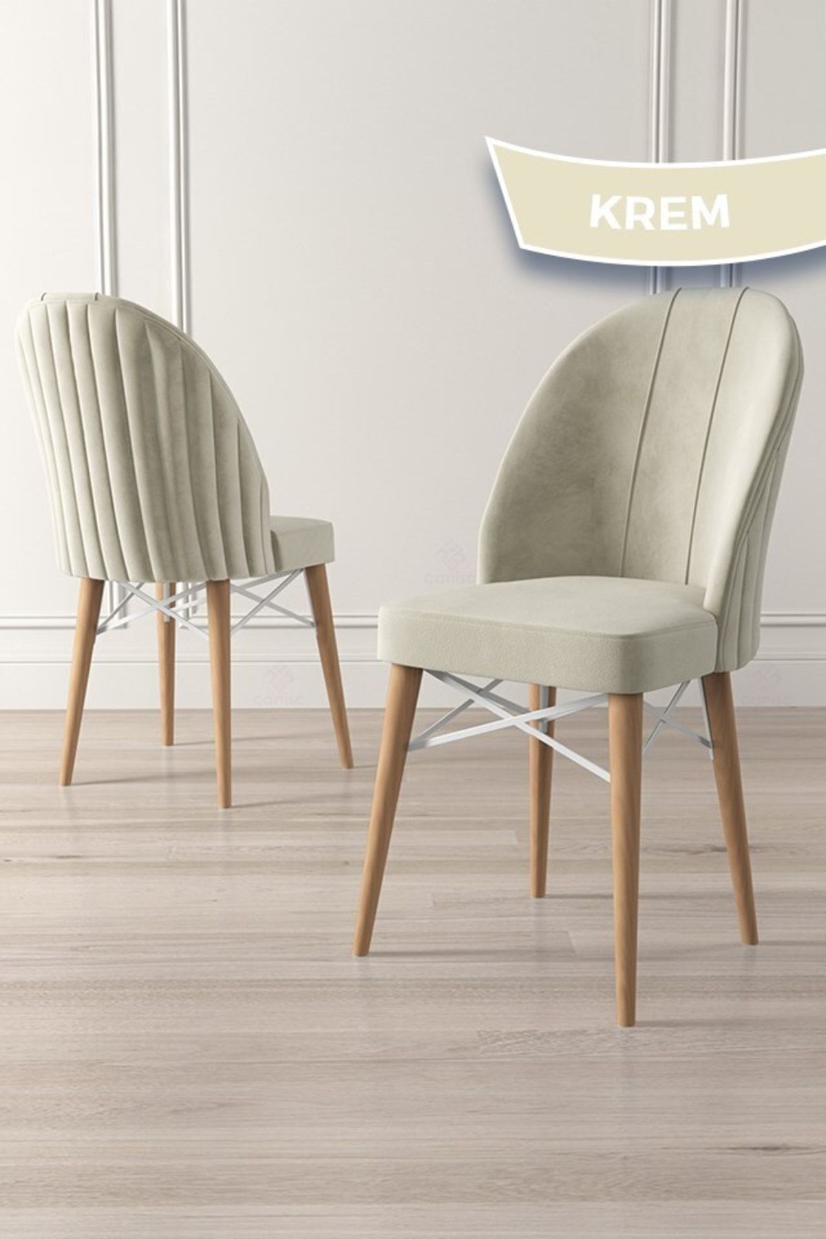Canisa Jena Serisi 6 Adet Krem Yemek Odası Sandalyesi Babyface Kumaş Doğal Ahşap Ayak Beyaz Kafes
