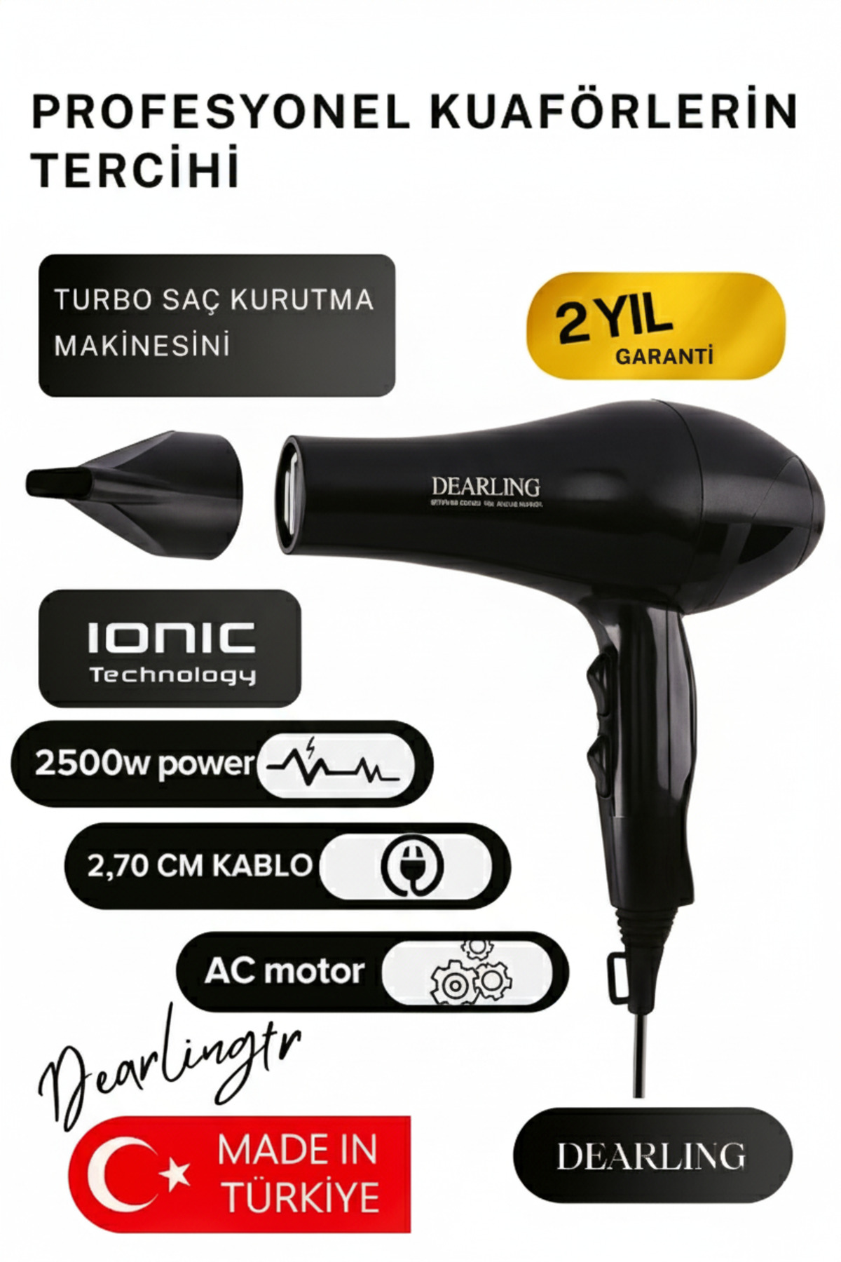 - Dearling Turbo W-4200 Professional Ac Motor Saç Kurutma Fön Makinesi + 2 Fön Başlığı (Dearling Türkiye Garantisi)