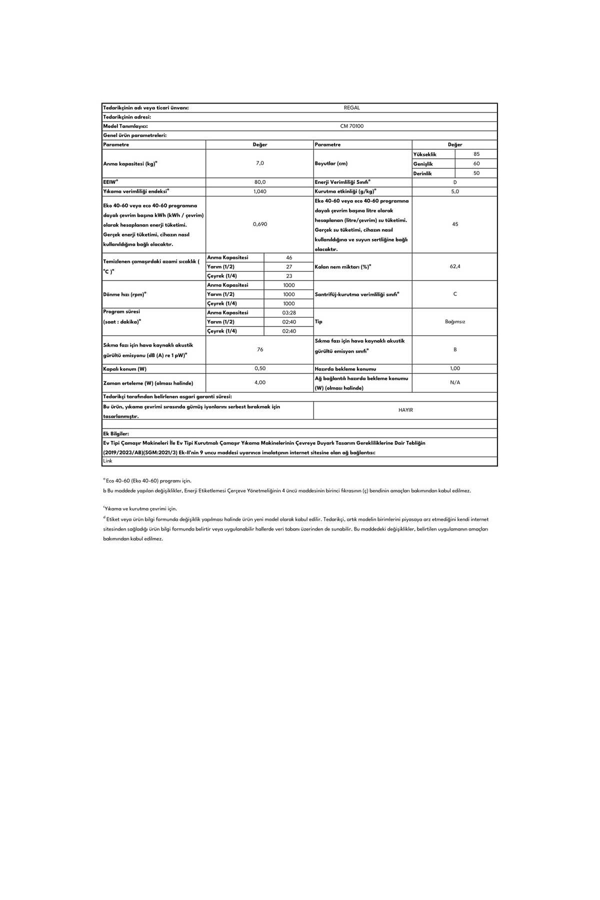 Regal CM 70100 Çamaşır Makinesi