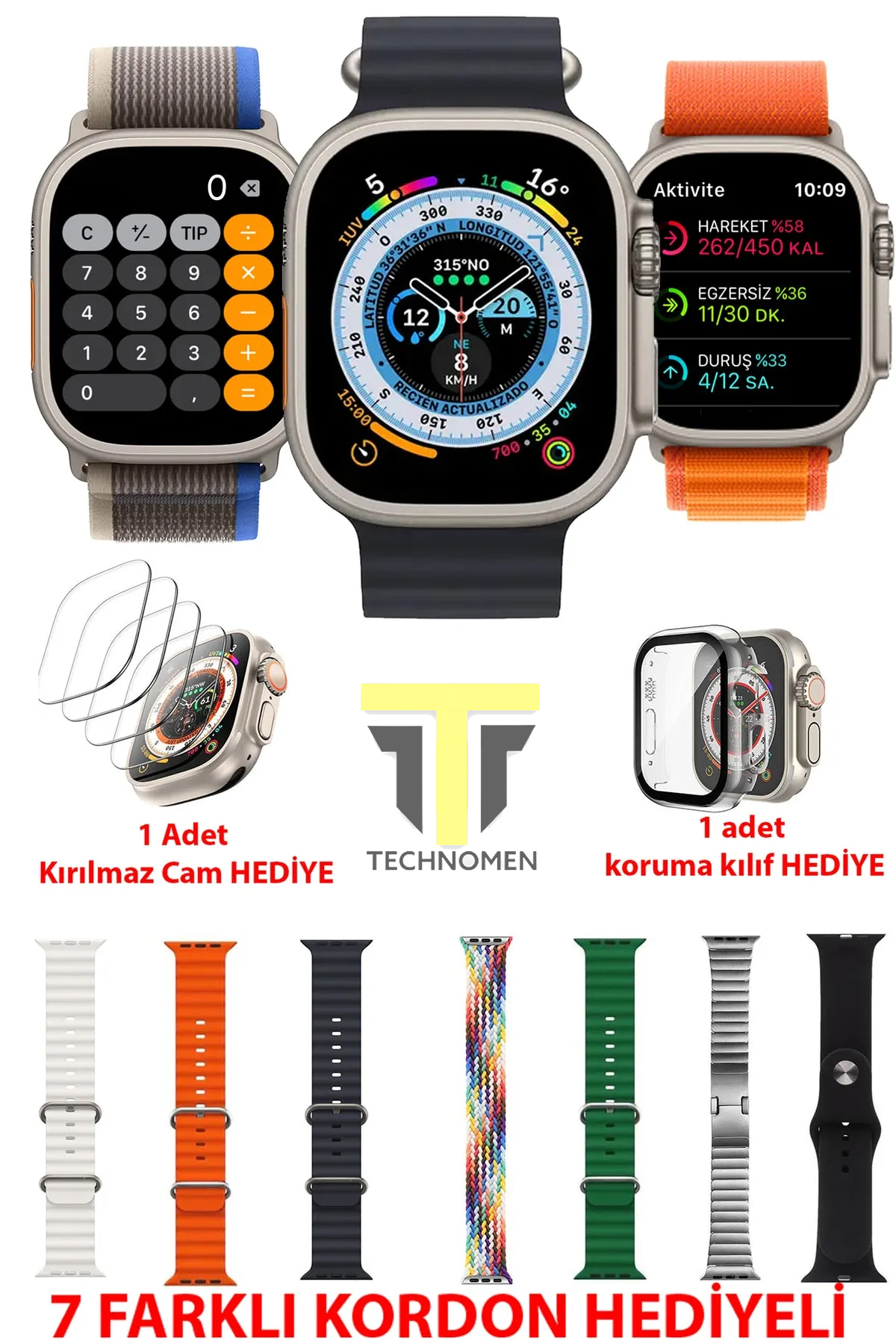 TECHNOMEN Akıllı Saat Y60 Ultra Plus 7 Kordon Hediye Kasa Koruma Kırılmaz Cam Smart Watch