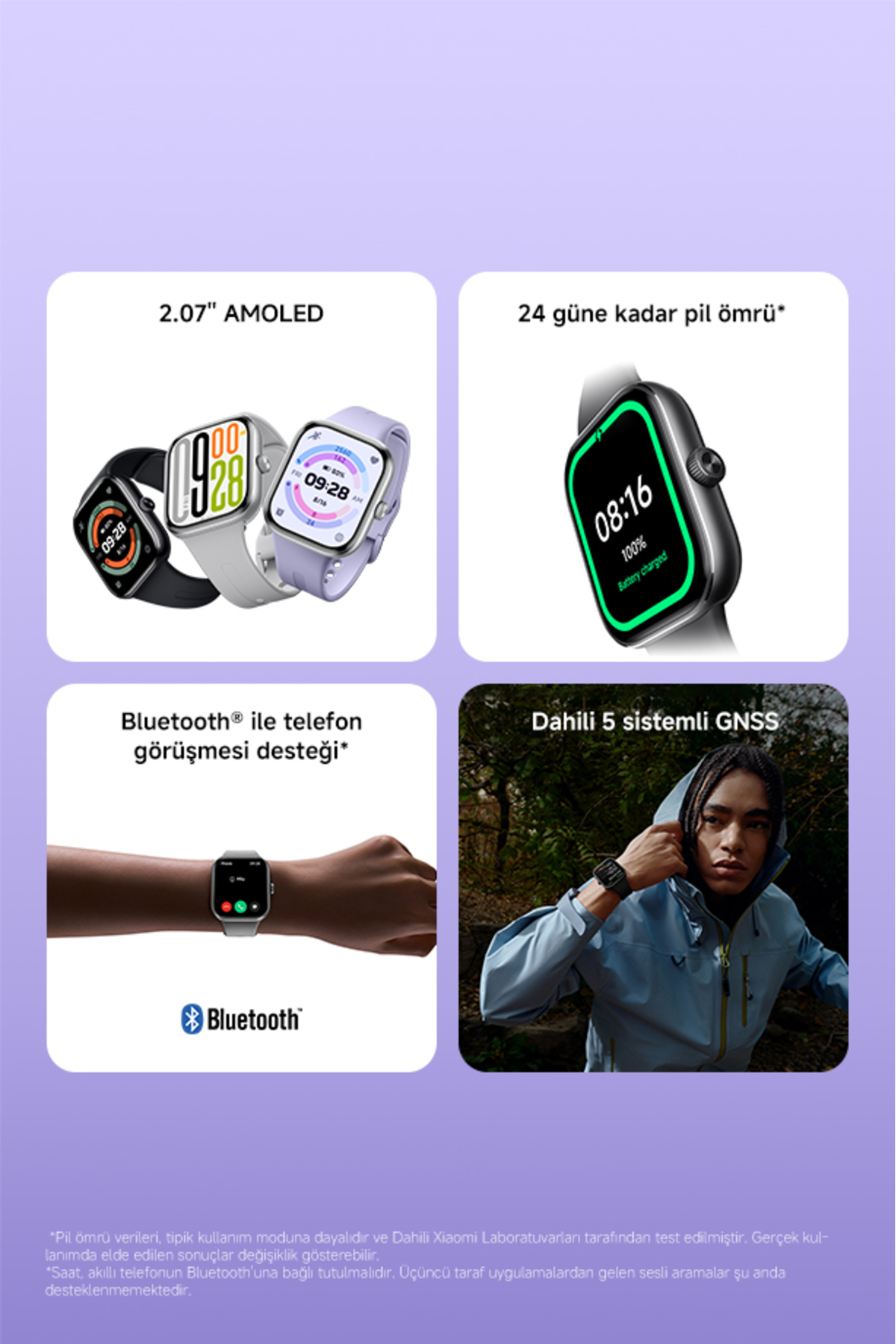 - Dahili GNSS: DestekleniyorSuya dayanıklılık derecesi: 5ATMKonuşmacı: DesteklendiMikrofon: 2 mikrofonBluetooth araması: DestekleniyorKablosuz bağlantı: Bluetooth® 5.3Yerel kullanılabilir depolama alanı: 164MB*Gerçek kullanılabilir bellek ve depolama kapasitesi değişebilir. İşletim sistemi ve önceden yüklenmiş programlar flaş belleğin (ROM) bir kısmını kapladığından, gerçek kullanılabilir depolama alanı flaş depolama için listelenen kapasiteden daha azdır.İşletim sistemi: Xiaomi HyperOSUyumluluk: Android 8.0 ve üzeri veya iOS 12.0 ve üzeri işletim sistemine sahip akıllı telefonları destekler.